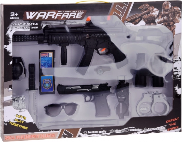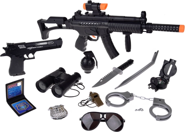 Setul oferă echipament complet pentru jocuri realiste de polițist sau ofițer militar.