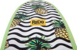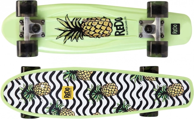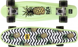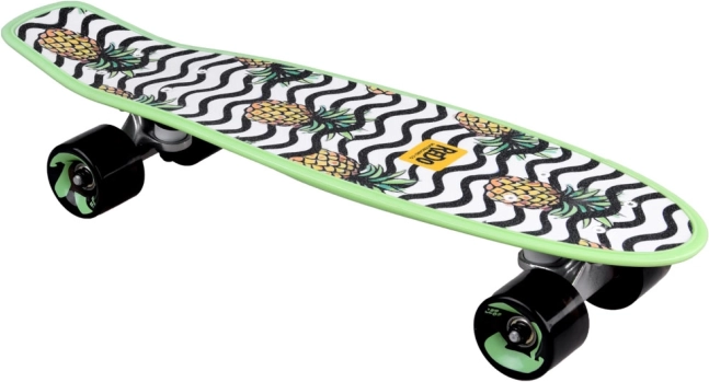 Acest skateboard se caracterizează prin aspectul său viu cu grafică de ananas și modele unduite alb-negru, oferind un design distractiv și atrăgător.