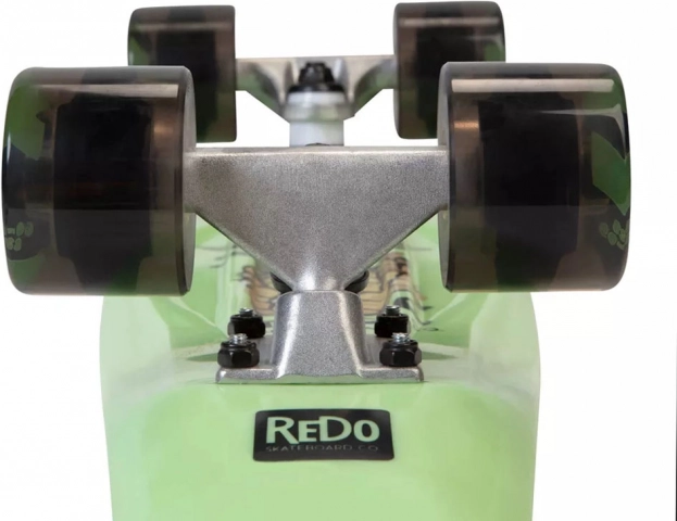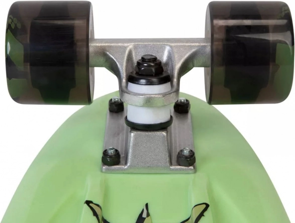 Skateboard-ul este echipat cu roți negre și camioane metalice, asigurând stabilitate și o rulare lină.