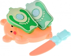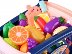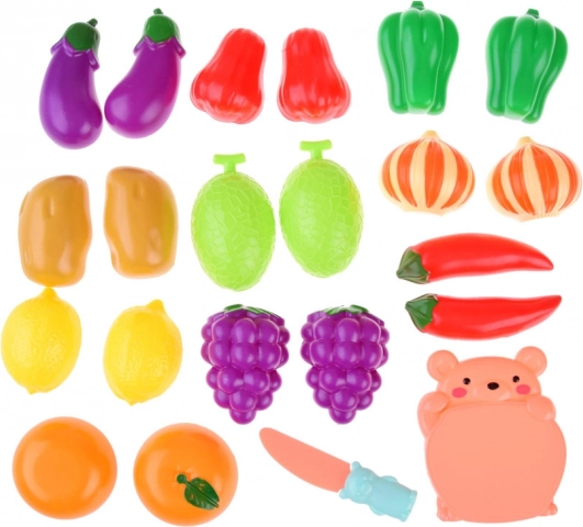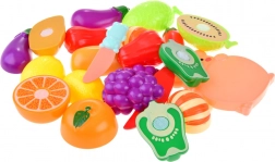 Legumele/fructele sunt de asemenea din plastic, în culori atractive. Se prind între ele cu ajutorul unei benzi cu arici, astfel încât copilul poate „tăia” alimentele în joacă.