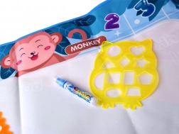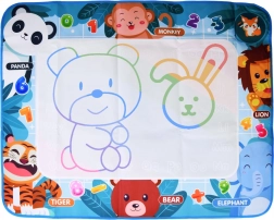 Acest covoraș colorat de 98 x 78 cm are un fundal plin de culori care transformă fiecare creație într-o operă de artă pictată. Marginile covorașului sunt împodobite cu imagini de animale cu nume în limba engleză, permițând copiilor să învețe engleza în timp ce se joacă. Jocul este complet sigur – doar umpleți stiloul cu apă și începeți să desenați, pictați sau scrieți.