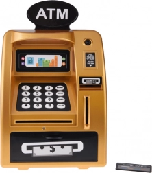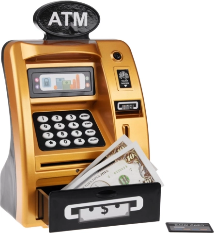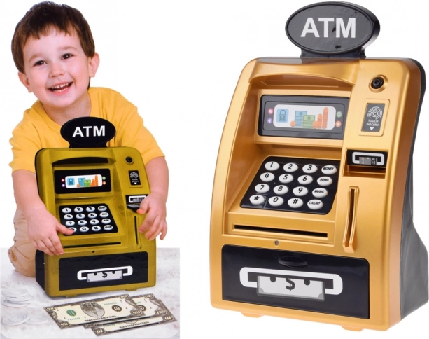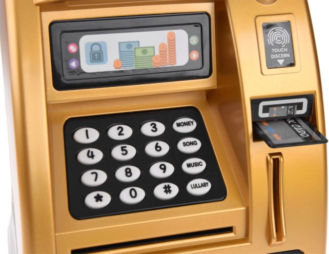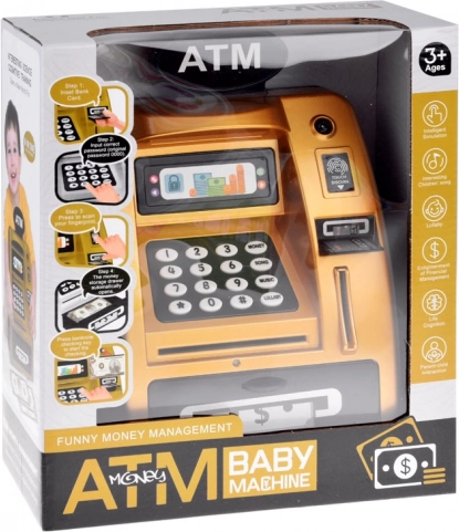 Faceți cunoștință cu bancomatul aurit, care arată și funcționează ca un bancomat real. Este fabricat din plastic cu un design realist ce include tastatură, ecran digital și fanta pentru card. Introducând cardul de jucărie și introducând codul PIN, copiii activează funcțiile bancomatului.