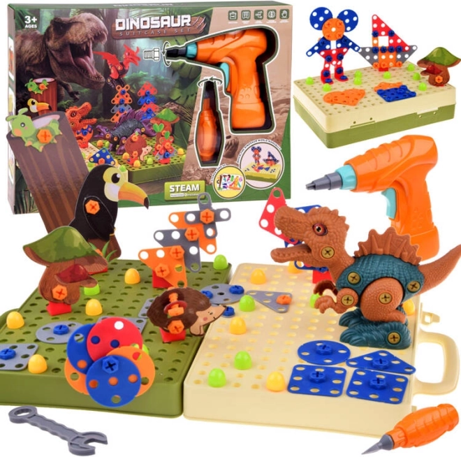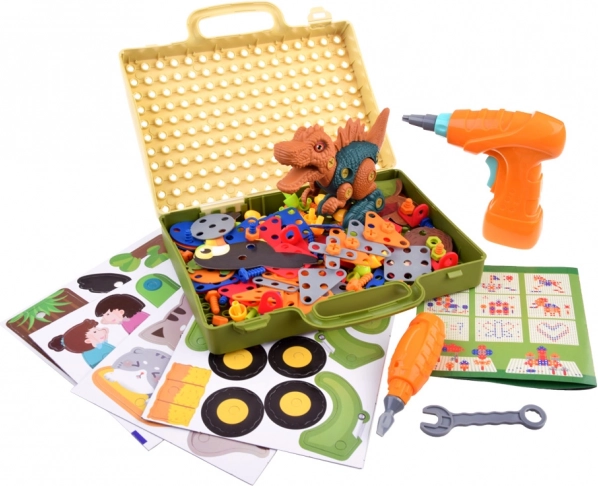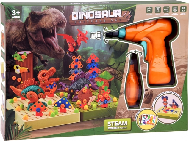 Construiește-ți propria lume preistorică cu setul creativ de construcție cu șuruburi pentru copii. Datorită bormașinii pentru copii, pe baterii, șuruburilor și pieselor colorate și geantei practice cu placă perforată, copiii își dezvoltă motricitatea fină, gândirea logică și imaginația.