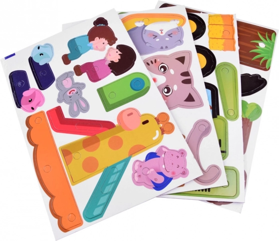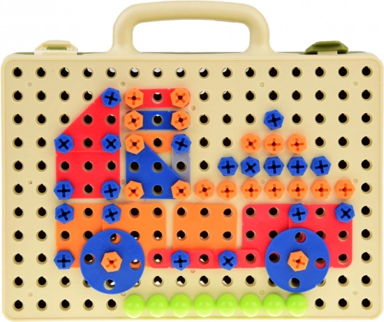 Geanta practică, cu capac perforat, servește drept bază pentru mozaicuri și modele. Toate piesele se păstrează într-un singur loc, iar copiii pot crea atât acasă, cât și în călătorii.