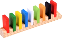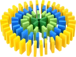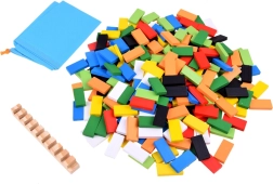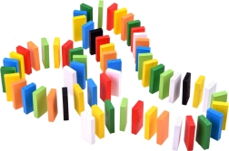 Setul de piese de domino Jokomisiada include 300 de elemente din lemn, atent finisate, în culori vii, ideale pentru construcții creative, reacții în lanț și joc liber. Copiii pot proiecta trasee simple sau complexe, pot experimenta cu forme și înălțimi, dezvoltând astfel imaginația și gândirea logică.