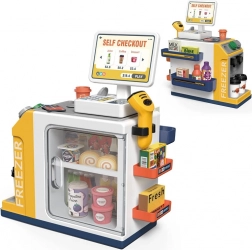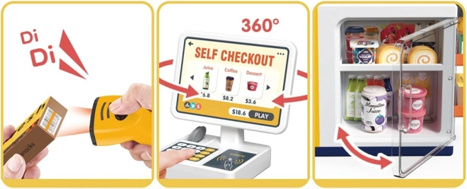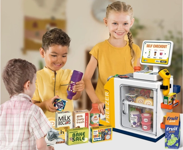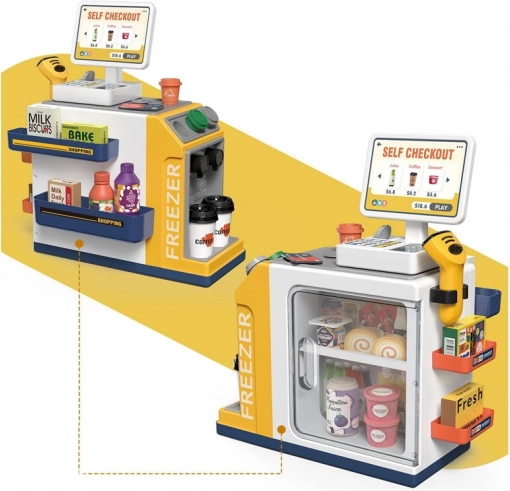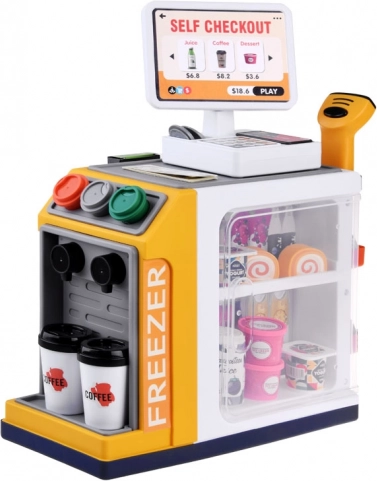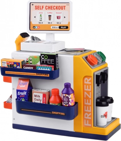 Această casă de marcat self-service realistă, cu colț de cafea, transformă camera într-un mic supermarket. Copiii pot exersa deservirea clienților, prepararea cafelei, scanarea produselor și plata cu cardul sau „cash”. Congelatorul/frigiderul integrat pentru deserturi și băuturi, butoanele colorate și afișajul creează o experiență autentică.