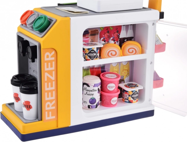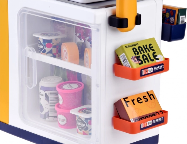 Compartimentul de răcire cu închidere găzduiește iaurturi, sucuri, deserturi și alte machete de alimente. Ideal pentru joc de-a cafeneaua, magazinul și casa de marcat self-service.