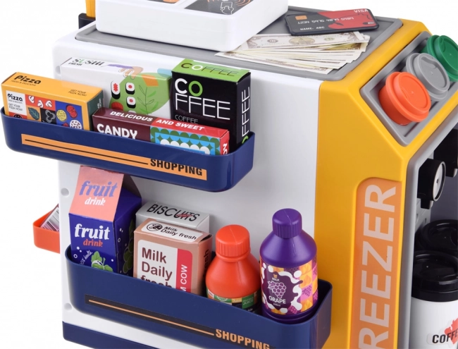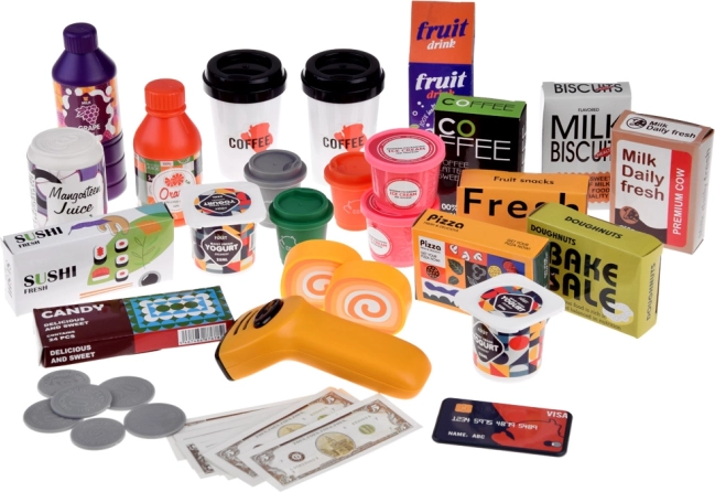 Pahare pentru cafea și espresso, bancnote, monede, card de credit, precum și diverse băuturi și cutiuțe cu produse – totul pentru joc de rol creativ și dezvoltarea imaginației.