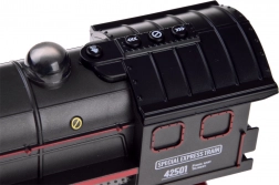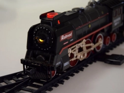 După turnarea apei în orificiul de pe acoperiș, locomotiva eliberează abur sigur, iar în mers se aprinde farul LED frontal și coșul are o iluminare roșie.