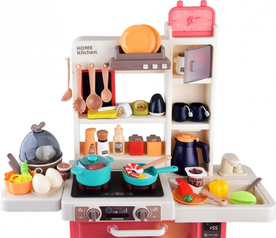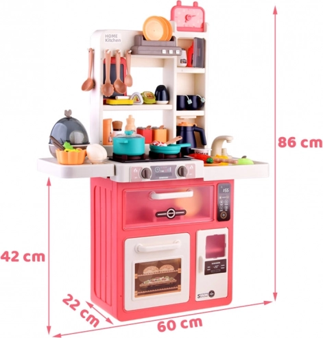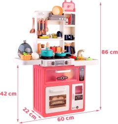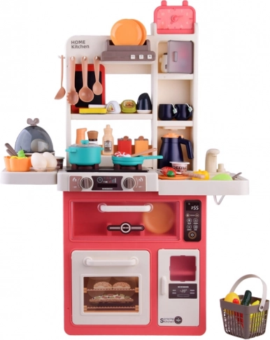 Bucătărie mare pentru copii cu 63 de piese, oferă efecte de lumină și sunet realiste, abur sigur la gătit și robinet funcțional cu circuit de apă. Include cuptor, mașină de spălat vase, frigider, blat de lucru și panou cu butoane iluminate și melodii. Ideală pentru joacă de-a gătitul și dezvoltarea imaginației.