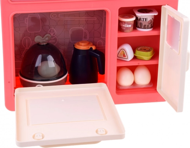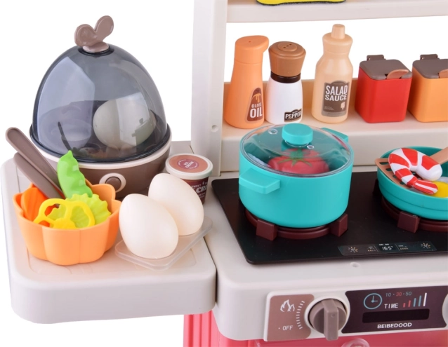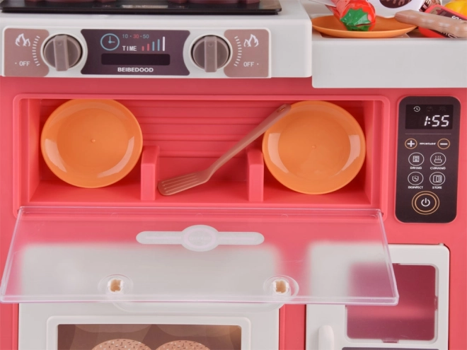 Această bucătărie independentă, în combinație crem-roz, transformă camera copilului într-o mică gospodărie. Aragazul redă sunete de gătit și clocot, completate de lumini LED și abur rece sigur pentru o experiență și mai realistă. Panoul superior cu butoane iluminate redă melodii vesele și liniștitoare și simulează absorția aburului.