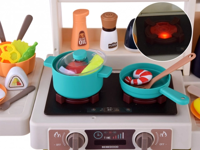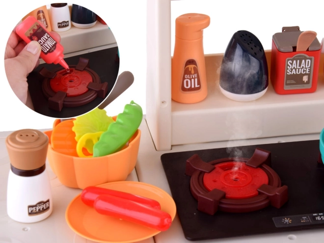 Arzătoarele se aprind la rotirea butonului, redau sunete de gătit și generează abur rece sigur pentru o joacă cât mai realistă.
