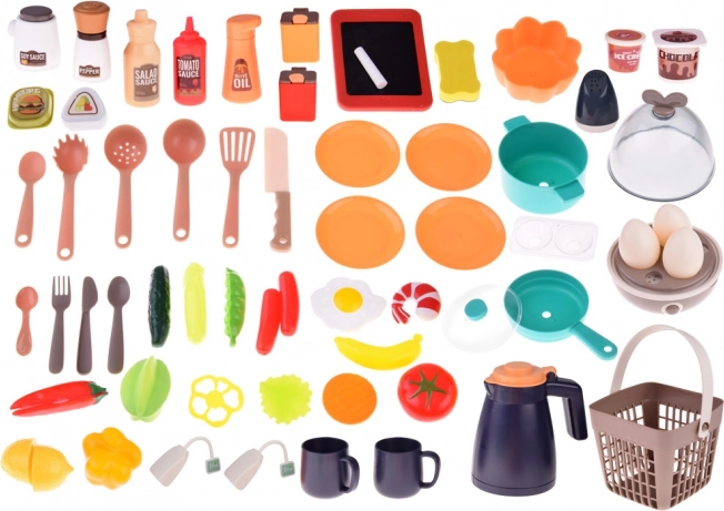 - Dotare bogată: oale, tigaie, ustensile, veselă, condimente, băuturi și multe alimente de joacă.