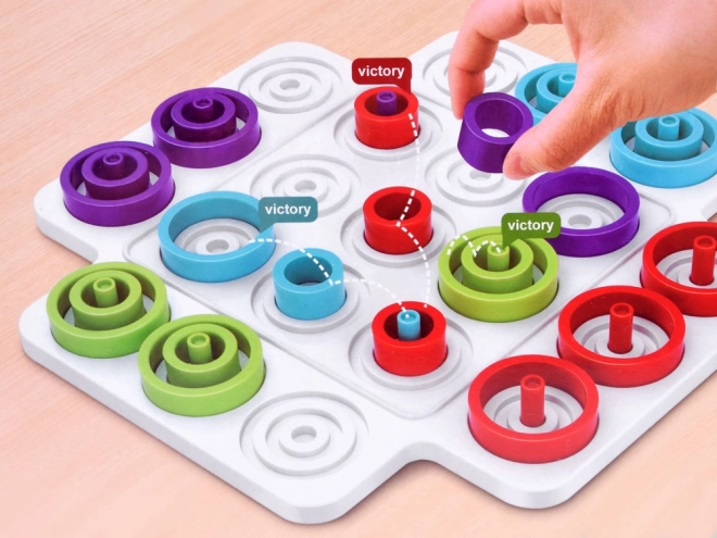 Trap este o variantă modernă a clasicului joc cu „x și 0” cu inele, care adaugă noi posibilități strategice. Scopul este să creezi o serie de trei elemente de aceeași culoare – dar poți câștiga și prin mărimi în ordine crescătoare sau descrescătoare, ori prin dimensiuni concentrice. Astfel, fiecare rundă este dinamică, rapidă și inteligentă.