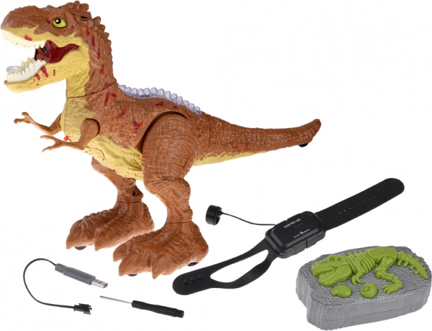 Modelul este realizat cu accent pe detalii realiste, are elemente luminoase pe spate și fălci iluminate în roșu. În pachet găsești tot ce ai nevoie: telecomandă RC, brățară cu senzor, acumulator 3,7 V 500 mAh, încărcător USB, șurubelniță și pipetă pentru completarea apei pentru efectul de abur.