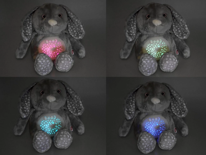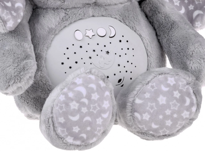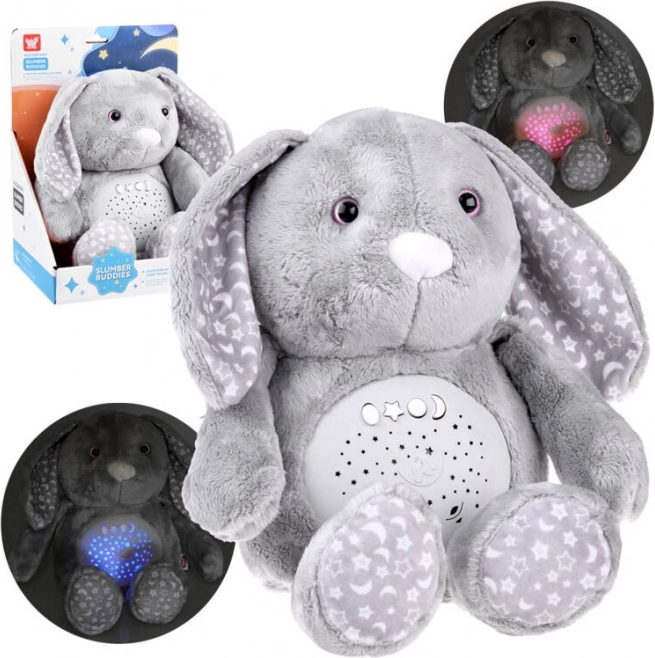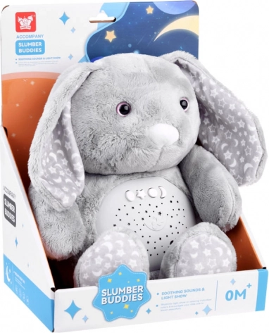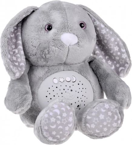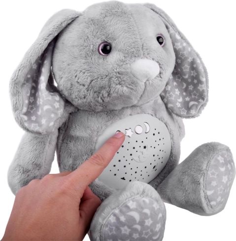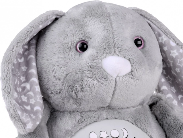 Acest iepuraș de pluș moale este fabricat din material delicat de culoare gri temperată, decorat cu modele de stele și lună pe urechi și picioare. Ochii sunt din plastic, în timp ce nasul este brodat, conferind jucăriei un aspect drăgălaș. Datorită panoului interactiv plasat în burtica iepurașului, devine un companion indispensabil pentru copiii care au dificultăți de a adormi singuri.