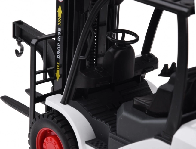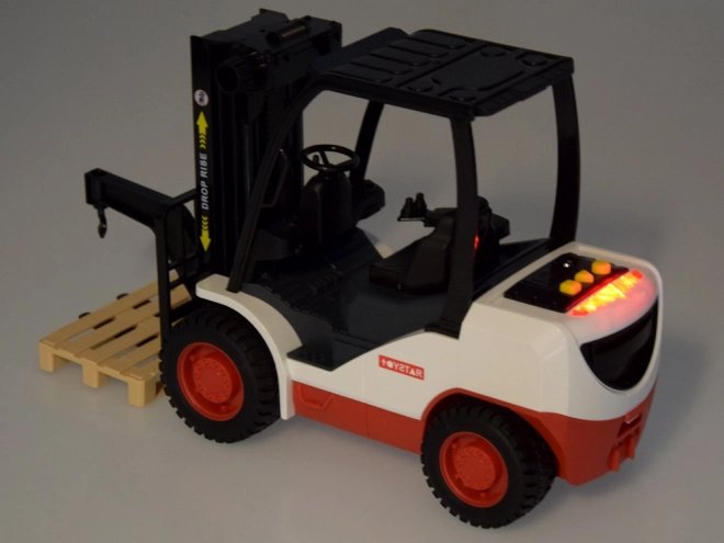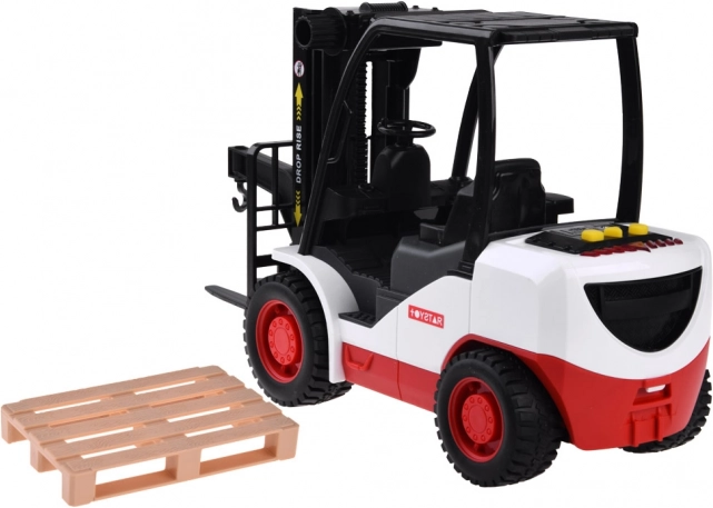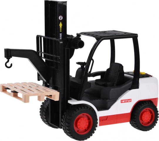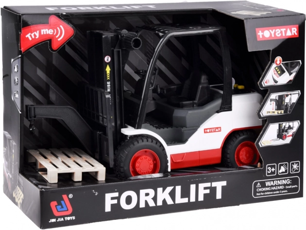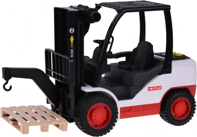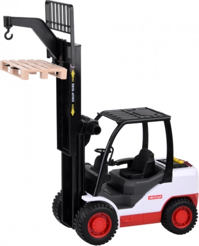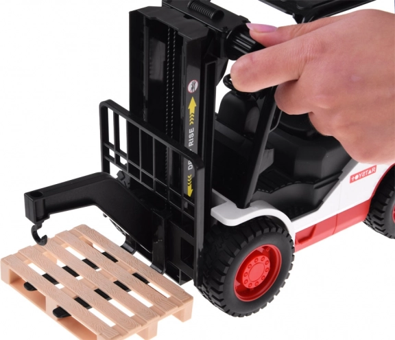 Setul include motostivuitorul și paleta, oferind copiilor posibilitatea de a se juca de-a construcțiile și operațiunile logistice. Stivuitorul are roți din cauciuc pentru mișcare ușoară și un mecanism de ridicare ajustabil, care poate fi controlat cu ajutorul unei manivele.