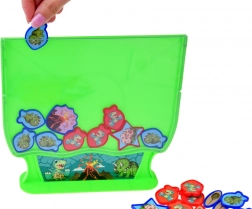 Cușca robustă din plastic, cu motiv cu dinozauri și vulcan, este scena principală a jocului. Jetoanele aruncate se așază în siguranță în interior, astfel încât jocul rămâne clar, rapid și fără dezordine inutilă.