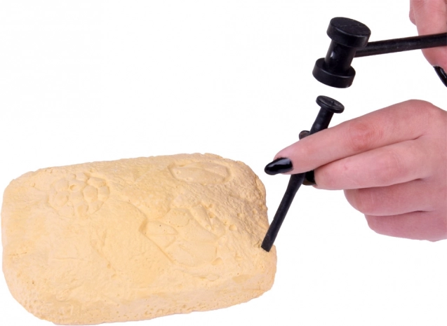 Procedura este simplă: mai întâi bateți ușor cu ciocănelul, răzuiți atent cu dalta, apoi curățați pietrele cu pensula. Copiii își exersează motricitatea, concentrarea și răbdarea și, în același timp, fac cunoștință cu lumea mineralelor și a geologiei.