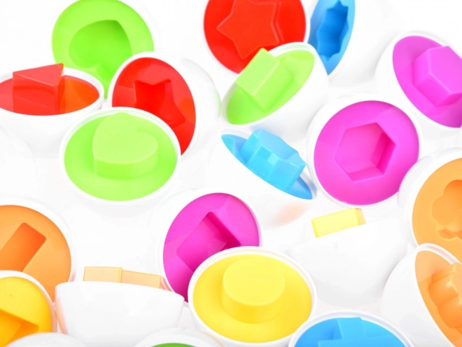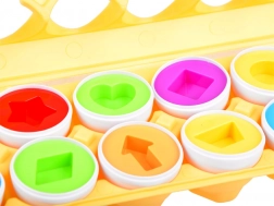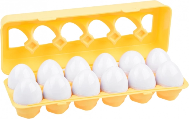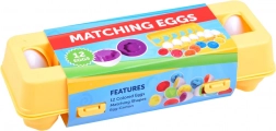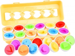 Acest set ingenios conține 12 ouă albe ascunse într-o tavă galbenă din plastic. În interior, copiii găsesc jumătăți colorate cu forme care trebuie asortate corect după culoare și formă (de ex. stea, inimă, cerc, pătrat și altele). Jocul sprijină dezvoltarea timpurie a abilităților, învață răbdarea și concentrarea.