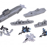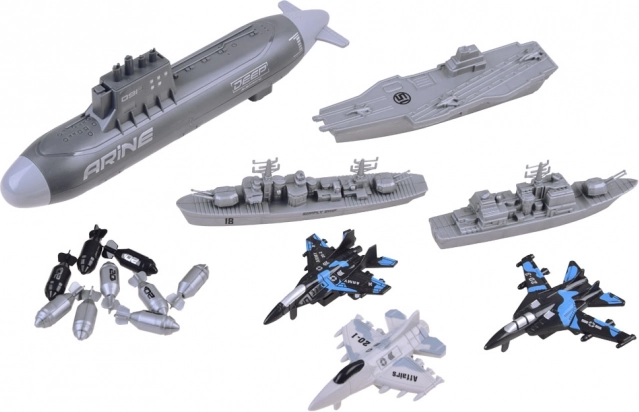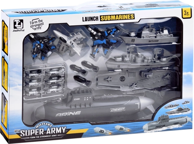 Acest set complex de tehnică militară aduce copiilor lumea operațiunilor navale și a sprijinului aerian. Datorită combinației de submarin, nave și avioane de vânătoare, pot crea propriile scenarii, planifica strategii și dezvolta imaginația. Formele realiste, culorile sobre și inscripțiile accentuează atmosfera unei bătălii navale.