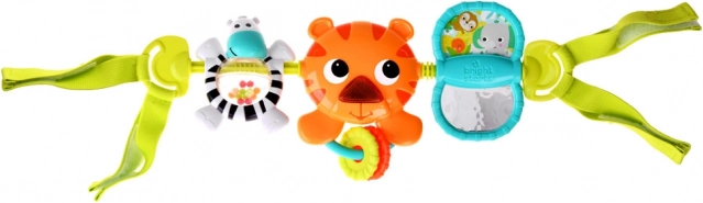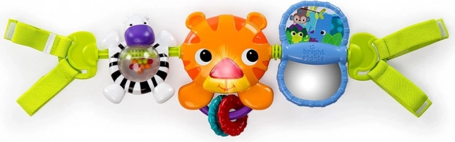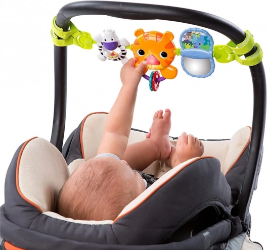 Cu ajutorul benzilor textile, jucăria poate fi ușor atașată la cărucior, scaun auto sau pătuț, oferind distracție acasă și în deplasare.