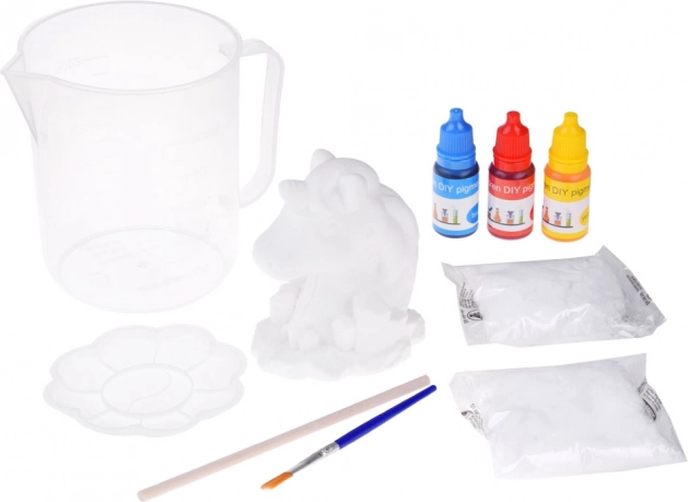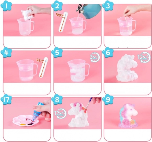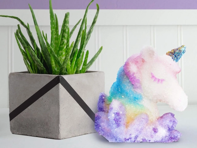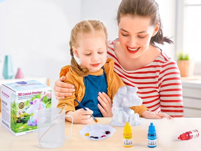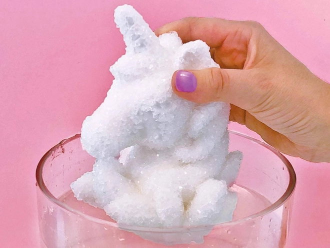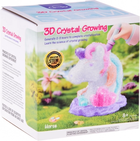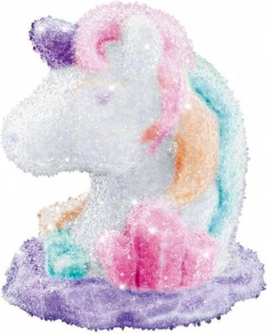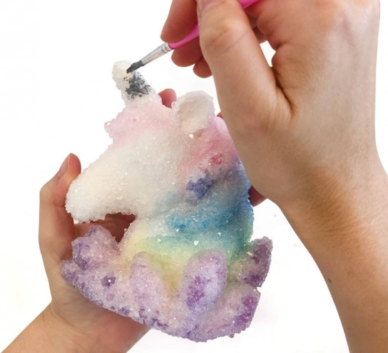 Scufundați figurina în soluția pregătită și priviți cum încep să crească cristalele pe ea. După uscare, unicornul poate fi colorat după propria imaginație, oferind posibilități infinite și întărind gândirea creativă a copiilor.