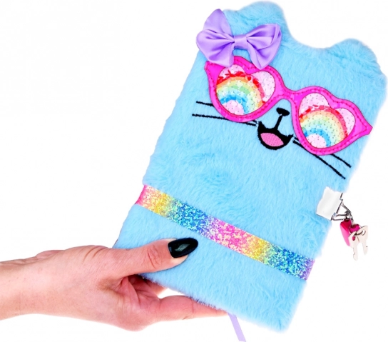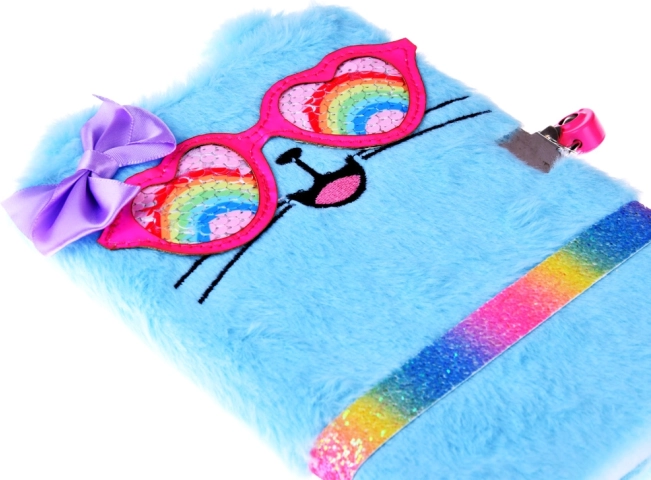 Copertă albastră din pluș cu detalii brodate ce amintesc de o pisică. Ochelari de soare curcubeu din paiete și fundă violetă adaugă o notă colorată.