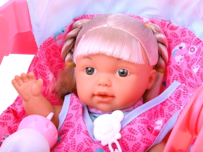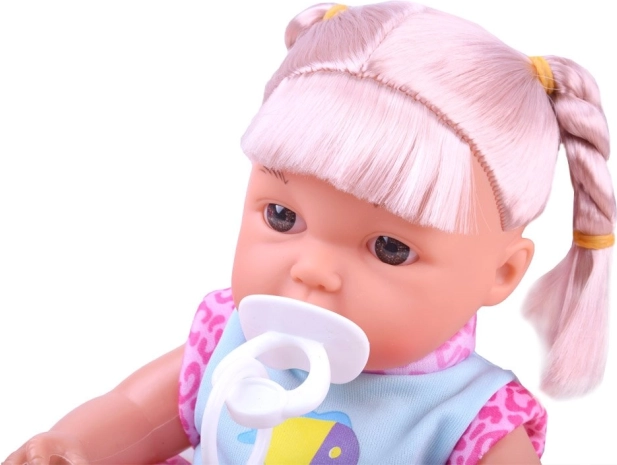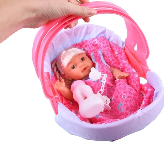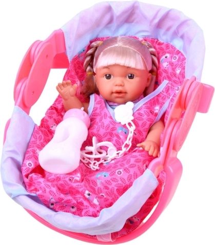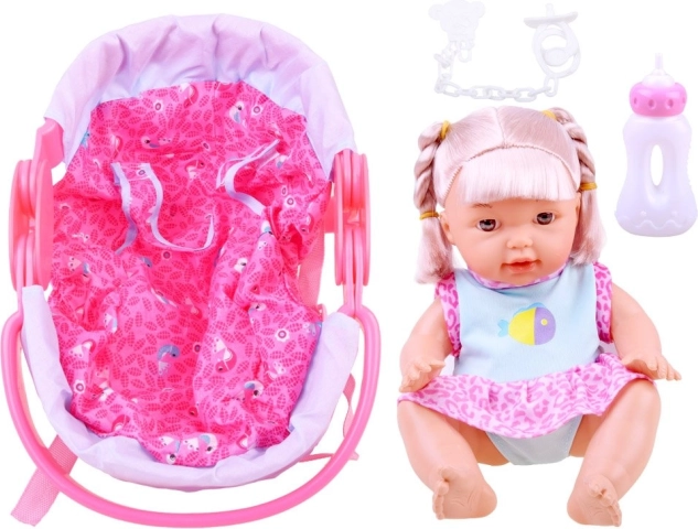 Setul include o păpușă drăguță, o sticluță, o suzetă pe lanț și un purtător.