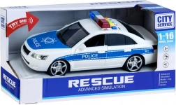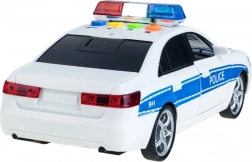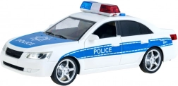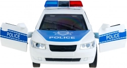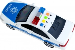 Mașină de poliție realistă cu detalii precum lumini albastre și roșii și inscripții 'POLICE'.