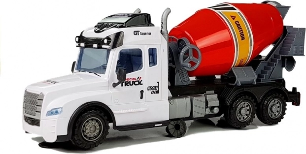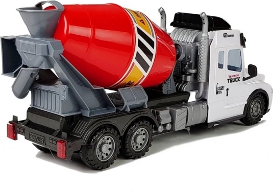 .Vehicul de construcții cu telecomandă pentru copii este echipat cu roți din plastic cu profil, care permit joaca pe diverse suprafețe. Betonierea albă cu cuvă roșie este decorată cu detalii negre contrastante și autocolante vizibile.