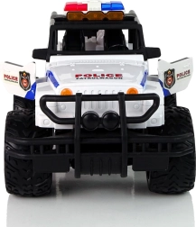 Jucăria cu design negru-alb caracteristic, roți mari și însemne de poliție pentru a imita perfect acțiunea reală a poliției.