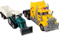 Capul tractor cu semiremorcă le permite micilor constructori să transporte utilaje și materiale ca în realitate. Camionul se controlează cu telecomanda, astfel încât se poate manevra comod înainte, înapoi și la viraje, în timp ce luminile LED de pe acoperiș adaugă un efect atractiv. Excavatorul pe șenile cu remorcă detașabilă completează perfect scenariile de construcții și extinde posibilitățile de joc.