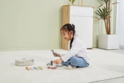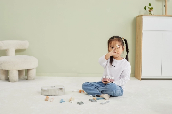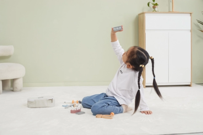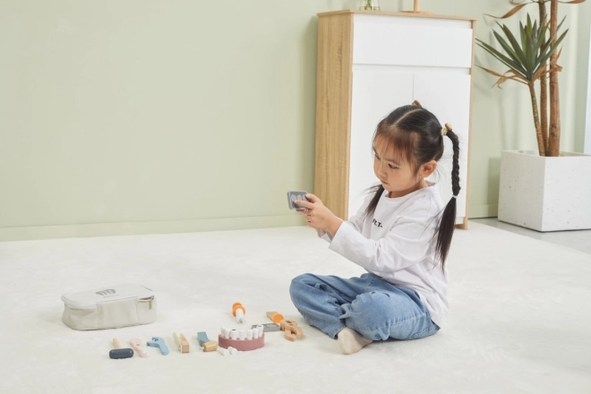 Totul este păstrat într-o geantă portabilă și rezistentă, astfel încât setul se transportă și se strânge cu ușurință. Lemnul lăcuit de calitate și vopselele netoxice asigură o distracție sigură și de durată. Cadoul ideal pentru micii dentiști.