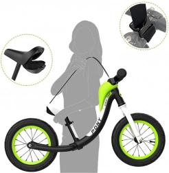 Înălțimea șeii este reglabilă (aprox. 31–38 cm) și crește odată cu copilul, iar ghidonul ergonomic cu mânere antiderapante oferă un plus de siguranță la direcție. Nu lipsește protectorul de cauciuc pe cadru pentru siguranță sporită. Părinții vor aprecia cureaua de transport și compartimentul ingenios din șa, care poate găzdui cureaua și mici obiecte.