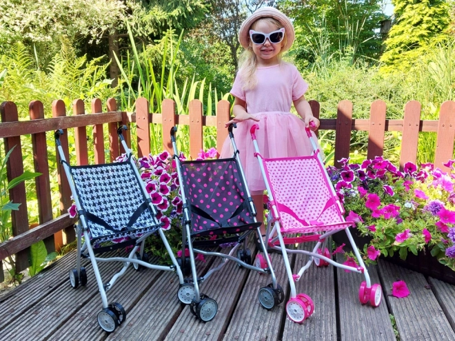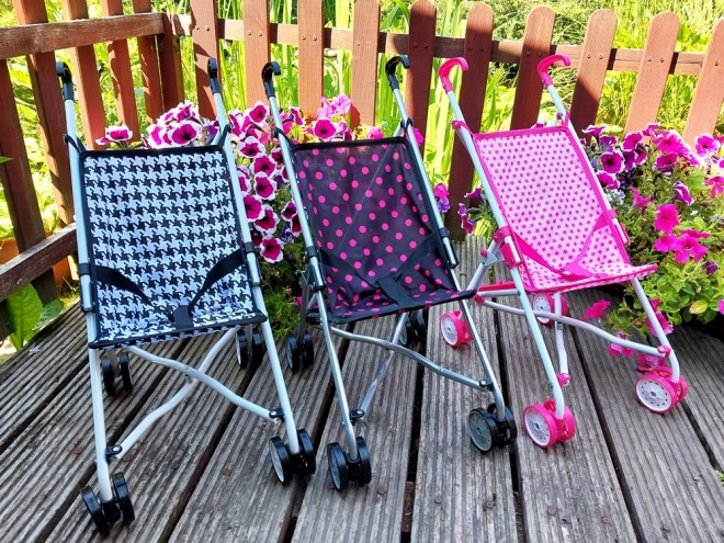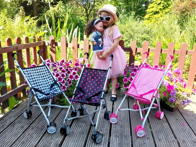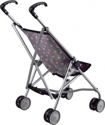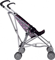 Șezutul textil în design modern, negru cu buline roz, este durabil și plăcut la atingere. Roțile duble garantează trecere lină și o bună manevrabilitate pe suprafețe diferite. Mecanismele sigure de pliere/desfacere și curelele din șezut ajută la menținerea păpușii pe poziție.