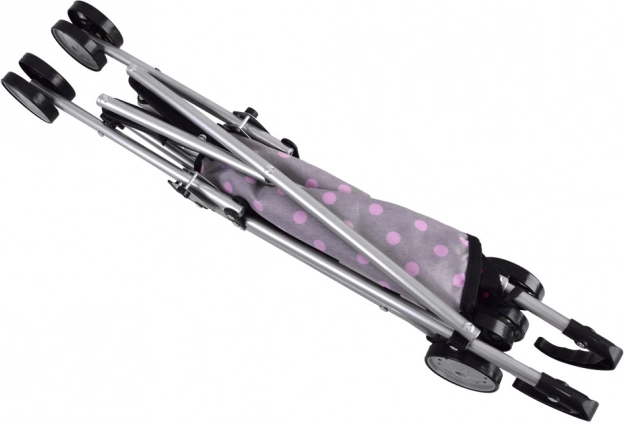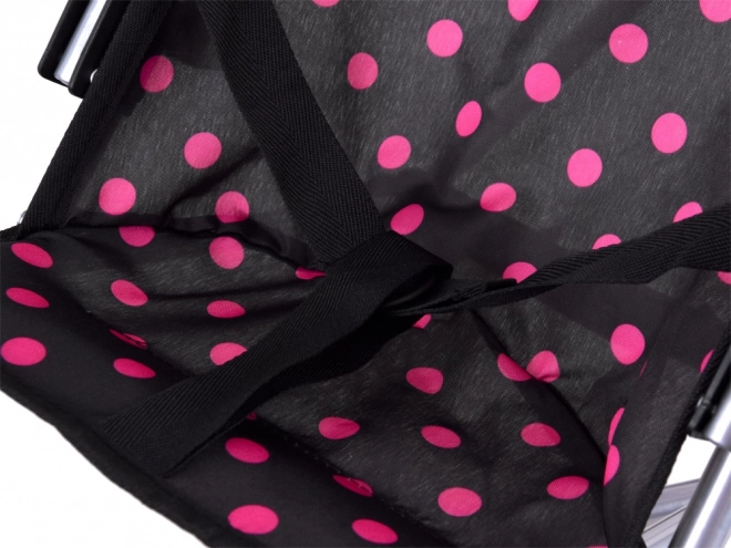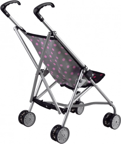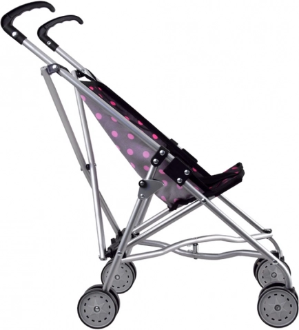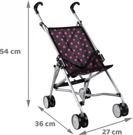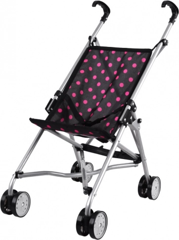 Cărucior ușor și compact pentru păpuși, în culoare neagră cu buline roz, care va încânta orice copil. Datorită construcției metalice robuste, mânerele confortabile și roților duble pentru rulare lină, se manevrează excelent și este sigur pentru joaca de zi cu zi.