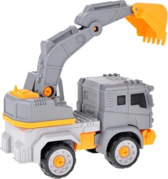 Setul include o șurubelniță și un șurub de rezervă. Copiii pot desface roțile, masca, cabina cu brațul și cupa și să reasambleze totul.