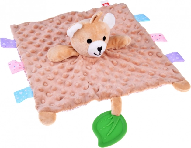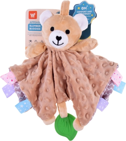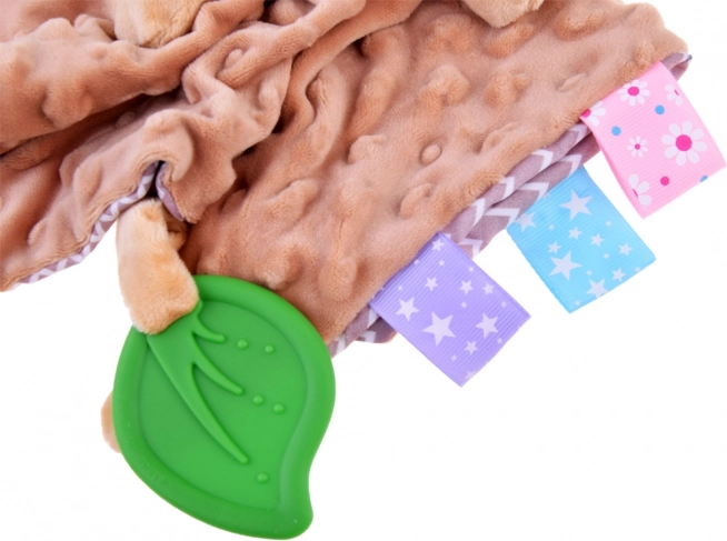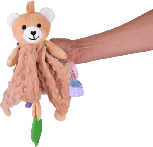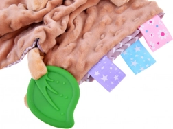 Această păturică-jucărie moale combină confortul unei pături de alint cu o jucărie senzorială. Copilul va fi atras de texturile variate, de elementele foșnitoare și piuitoare, precum și de etichetele colorate de pe margini, care invită la atins, mototolit și tras. Frunza verde din silicon servește drept mușcător și ajută la masarea gingiilor sensibile în timpul erupției dinților.