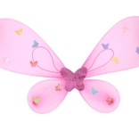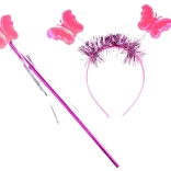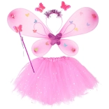 Aripi roz aprins cu fluturași colorati, completate de o baghetă și o diademă asortate – totul într-un stil de zână unitar.