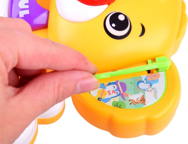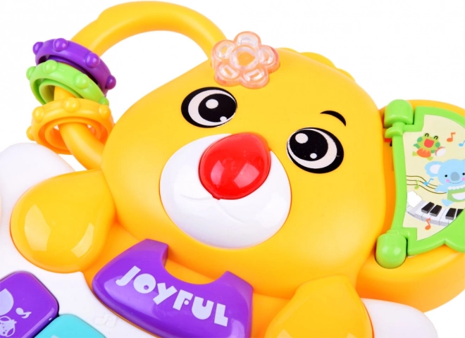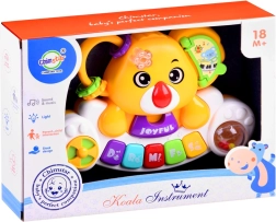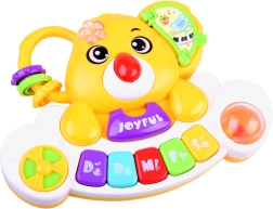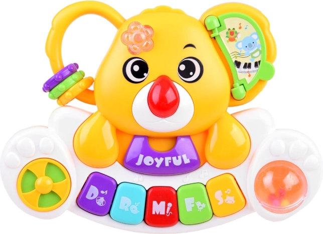 Această pianină interactivă și colorată îmbină învățarea cu distracția. Copiii se familiarizează cu scala de bază Do–So, ascultă melodii vesele și sunete autentice de animale (câine, cocoș, cal, pisică, elefant). Fiecare apăsare a clapelor este însoțită de o lumină clipitoare care își schimbă culorile și stimulează percepția vizuală.