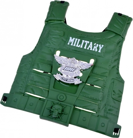 Vestă ușoară din plastic, cu detalii „MILITARY” și elemente ajustabile, care oferă fiecărei misiuni un aspect autentic și confort la purtare.