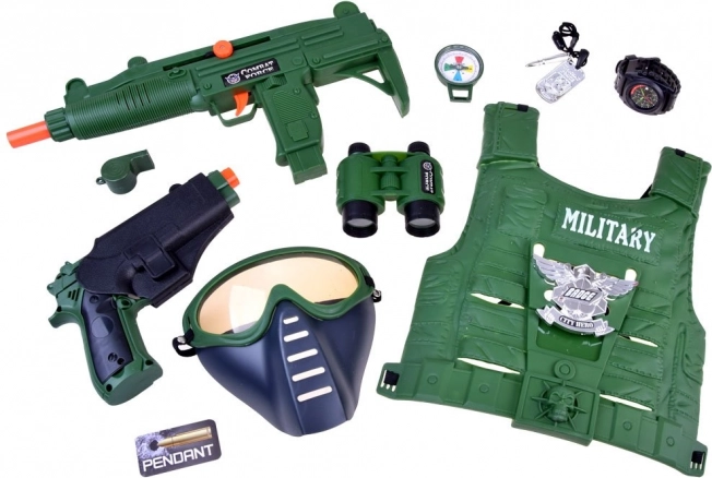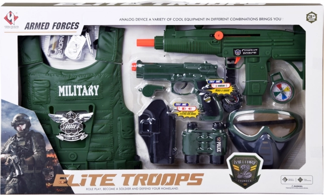 Acest set militar complet îi va încânta pe toți micii aventurieri. Datorită vestei tactice ușoare și gamei largi de accesorii, copiii pot interpreta cu ușurință rolul de cercetași, gardieni sau eroi. Armele cu efecte sonore și masca detașabilă adaugă autenticitate jocului, în timp ce busola și binoclul susțin imaginația și orientarea pe teren.