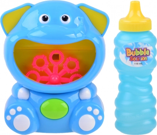 Pachetul include un automat din plastic în formă de elefant și o sticluță cu soluție pentru baloane – poți începe imediat după introducerea bateriilor.