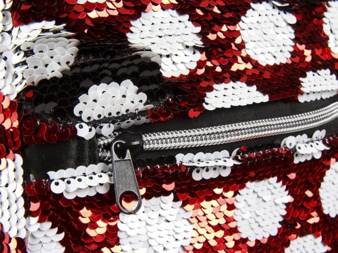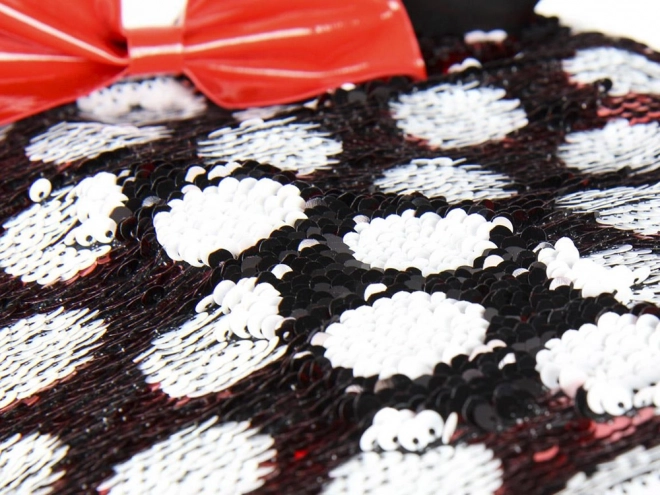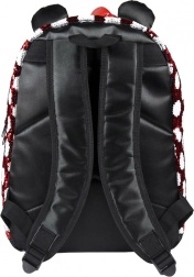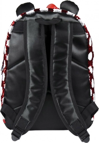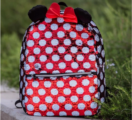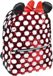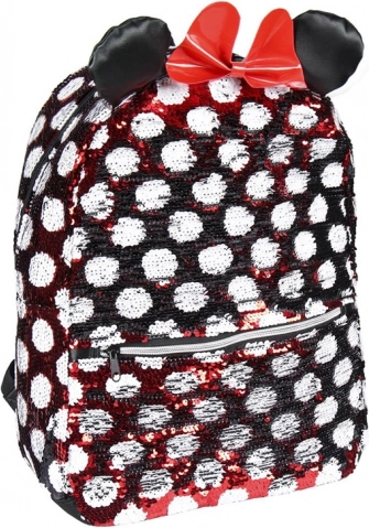 Rucsacul cu modelul caracteristic Minnie în combinația roșu și alb cu buline, împodobit cu o fundiță roșie și urechi sclipitoare, este cu adevărat fermecător.