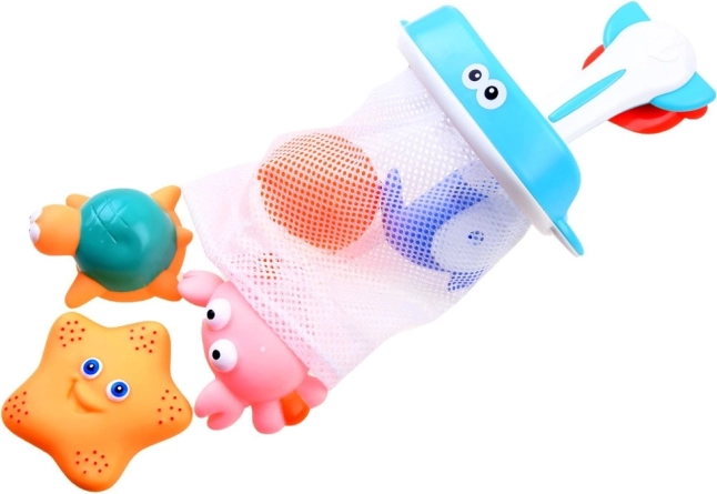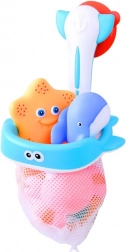 - plasă cu ventuză, 3 bărcuțe, 3 bile–animăluțe detașabile, 4 pahare, 6 animăluțe din cauciuc