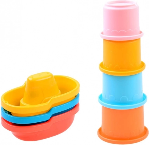 Construiește, toarnă și fă curse. Paharele suprapozabile cu orificii și cele trei bărcuțe plutitoare stimulează imaginația și experimentele amuzante cu apă.