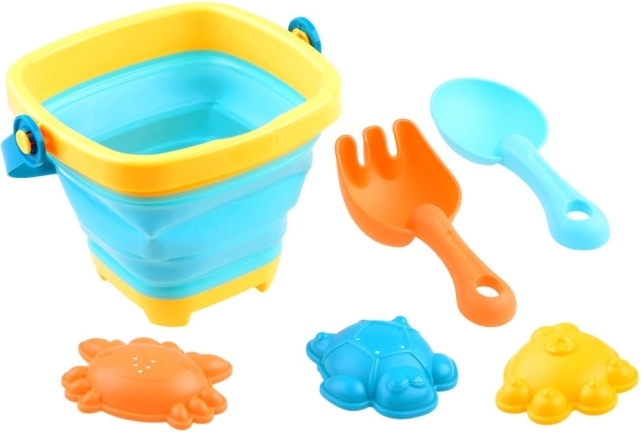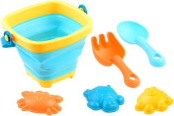 Conține tot ce au nevoie copiii pentru joaca creativă în nisip: găleată pliabilă, lopată, greblă și trei forme.