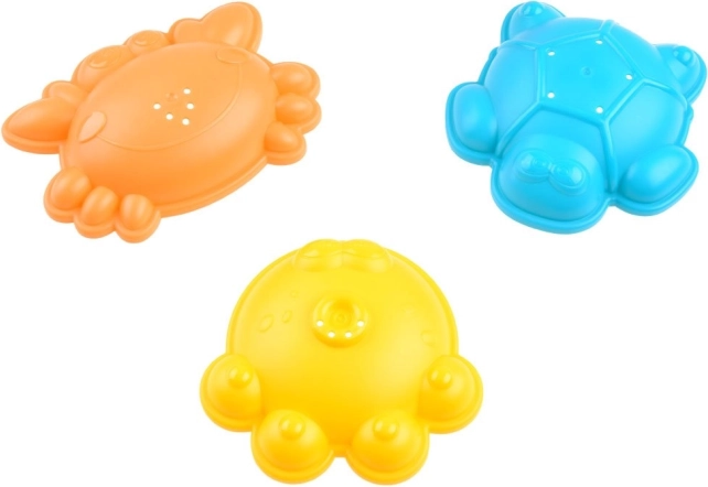 Trei forme cu motive de crab, broască țestoasă și caracatiță asigură multă distracție. Fiecare are găuri pentru eliberarea ușoară a nisipului.