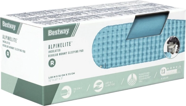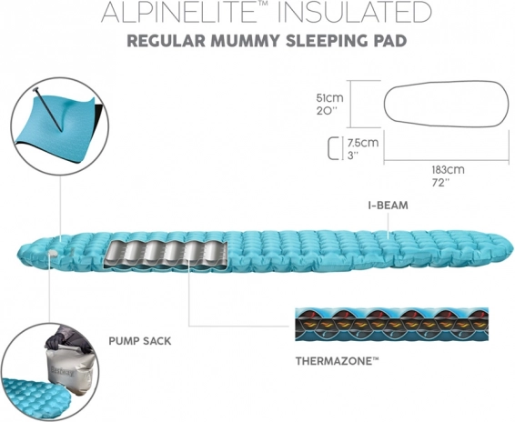 Salteaua AlpineLite Insulated Regular Mummy este alegerea ideală pentru cei care doresc să se bucure de confort în timpul relaxării pe plajă, la camping sau la înnoptări în cort. Umflarea este ușoară și rapidă datorită sistemului inovator AirCinch™, unde este suficient să apeși cu palmele pe sac, iar salteaua se umple rapid cu aer. Acest set este complet, astfel încât nu trebuie să-ți faci griji că vei uita pompa.